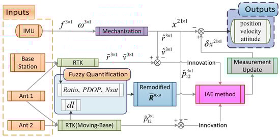 The paper is organized as follows. An overview of the two-antenna GPS/INS-integrated algorithm is provided in Section 2. In Section 3, the adaptive modification of noise covariance is discussed. The field experiment and results for different schemes are compared in Section 4 to verify the superiority of the proposed approach compared to existing methods. Finally, several conclusions of this work are drawn.