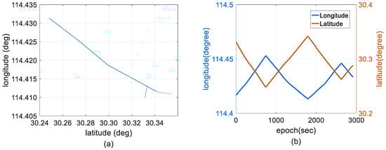 Reference trajectory. (a) Reference trajectory of dual-frequency ambiguity-fixed GPS/BDS/INS integration solutions processed by a backward filter with off-line Rauch–Tung–Striebel (RTS) optimal smoothing algorithm; and (b) reference longitude and latitude distributions for the whole duration.