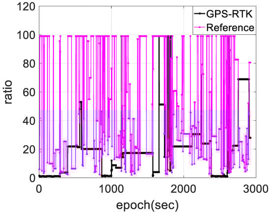 Figure 6 shows the AR ratio value distribution of the reference and those of GPS-RTK. The adoption of dual-frequency GPS/BDS/INS integration using a backward filter algorithm can improve the integer ambiguity resolution because better satellite availability from GPS/BDS and dual-frequency phase carrier adoption in data processing can further improve with a substantial decrease of ambiguity-float solutions, RTS smoother has an obvious accuracy advantage on filter, and INS provides strong constraints and short-term high accuracy to improve the accuracy of ambiguity-float solutions, position solutions with a centimeter error magnitude would be achieved. However, as a comparison, nearly 25% of the entire ratio solutions processed by single-frequency GPS-RTK using the forward-filter algorithm are fewer than three, and nearly 80% of the remaining solutions are considerably lower than the reference.