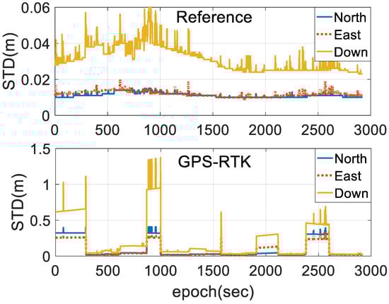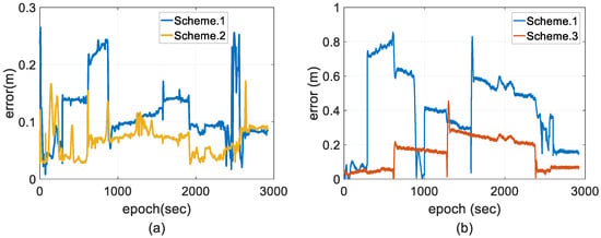 Figure 7 shows the positioning estimated state estimate error of the two schemes, illustrating that the stability of the state estimates is improved by the introduction of INS and BDS, and the state estimate error of the horizontal and vertical positions are bounded by 0.02 and 0.06 m, respectively, for the entire test durations. The solutions processed by single-frequency GPS-RTK using a forward filter are bounded by 0.05 and 0.2 m, respectively, when the system is in the steady state. However, the state estimate error of the horizontal and vertical position is increased by several decimeters under AR failure.