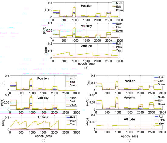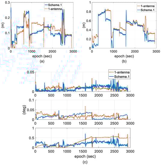 Error comparison of the one-antenna integration and the two-antenna integration using EKF. (a) Horizontal position; (b) vertical position; and (c) attitude.