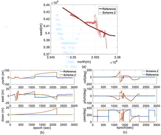 Figure 10 compares the trajectory, velocity, and attitude solutions processed by Scheme 2 with the reference, which demonstrates that positive feedback exists in filter updating before filter crashes occur.