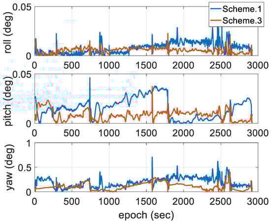 According to the theory of optimal state estimation, the accuracy of state estimates, especially attitude state estimates, can be improved because measurement redundancy is improved by using an augmented equation. We can see from Figure 15 that during a relatively steady measurement state, such as a length bias within 10 cm between the two antennas or a fixed AR, the proposed two-antenna integration generally performs better in terms of position and yaw accuracy; however, a negative effect is obvious under measurement outliers. Furthermore, there is no significant impact on roll and pitch because of the small error magnitude. In summary, the two-antenna GPS (or GNSS)-aided INS approach takes advantage of providing complete vehicle state, which improves filter performance [], and we chose low-accuracy single-frequency GPS positioning solutions as measurement to better demonstrate the inoperability of IAE method under situations that innovation contains both measurement and predicted unknown uncertainties; then, the statistics of both measurement and state noise have to be adapted, which indirectly proves that the CPI of the two-antenna approach is improved by the proposed adaptive method even when we use single-frequency receiver.