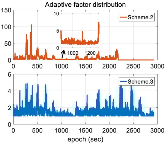 Figure 14 gives the adaptive factor results for the three schemes. It should be noted that we don’t discuss Scheme 1 since it uses conventional EKF without a corresponding adaptive reconfiguration on noise covariance. According to the figure, the impact of measurement outliers with respect to adaptive factor determination exists and the corresponding impact is more obvious when implementing EKF with IAE method. Conversely, Scheme 3 takes measurement unknown uncertainties into account by the measurement noise covariance reconfiguration in this research, significantly improving adaptive mechanization under measurement outlier conditions.
