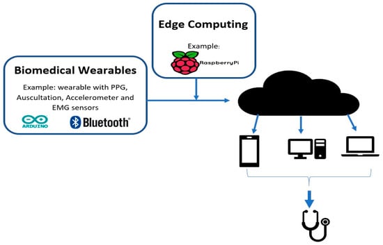 Biomedical wearables are especially important when considering the fast-paced lifestyle of most working-class people nowadays. A significant portion of the day is spent commuting between tasks, and often health and fitness are overlooked. In addition to that, the time-consuming task of going to the doctor for a diagnosis, a prescription, and then the treatment results in many people avoiding the doctor or going to a clinic until it is absolutely necessary []. This is why a significant amount of research is being done on ways to monitor a patient’s health and send the physician real-time data of their health parameters []. As a matter of fact, the implementation of these wearables creates a preventative approach to medicine where individuals can monitor their own biosignals longitudinally. This can also be referred to as telehealth, and, with the aid of the IoT, telehealth has become a prominent market. Telehealth, or telemedicine, is simply defined as the integration of communication technologies and healthcare, where technology is used as a medium to deliver the healthcare services []. Physicians or health staff can then remotely monitor the patient’s condition and provide medical suggestions and aid. Finally, data can also be stored on the cloud or secure servers for later use.