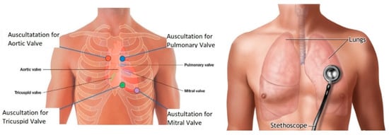 The first act that a medical professional performs in a diagnosis is auscultation, and that alone demonstrates its importance. Auscultation refers to the act of listening to the human body, and is usually done by using a Littmann stethoscope []. Therefore, cardiac auscultation refers to listening and interpreting heart sounds. It is a very cost-effective approach as well as being non-invasive and easy to use. Moreover, it is the most used technique by doctors for the primary screening of early cardiac illnesses []. Cardiovascular diseases are one of the major causes of death in the world; hence, it is important to evaluate cardiac functions using a fast, non-invasive technique []. The main heart sounds include S1 and S2. S1 occurs at the onset of ventricular contraction and corresponds to a QRS complex in an ECG. Electrocardiogram (ECG) represents the electrical activity of the heart and the QRS complex are the most visual peak and troughs of that ECG signal. The complex consists of 3 deflections labeled Q, R and S respectively. The second heart sound, S2, corresponds to the closure of semilunar valves and finally S3 and S4 can sometimes be heard as well as other clicks and snaps. Normal heart sounds range from 20 to 420 Hz []. Auscultation serves as the first point of diagnosis and vital sign monitoring. This is because listening to these sounds can reveal information regarding the status of the underlying functions. For example, heart sounds often reveal abnormalities if a murmur is present and allow for the detection of disorders of the body. Furthermore, there is a strong connection between the heart and the lungs, when compared to the rest of the body’s systems, which is known as the cardiopulmonary system. Therefore, when analyzing the cardiac system, it is common to consequentially analyze the lungs and breathing of the patient. This is referred to as lung auscultation, which is used to detect respiratory disorders. Lung sounds can be classified into three categories: normal, abnormal, and adventitious. Normal sounds are quiet and hardly audible; abnormal sounds refer to the lack of these normal sounds; and adventitious sounds refer to wheezing and crackles that are strong indicators of disease [].