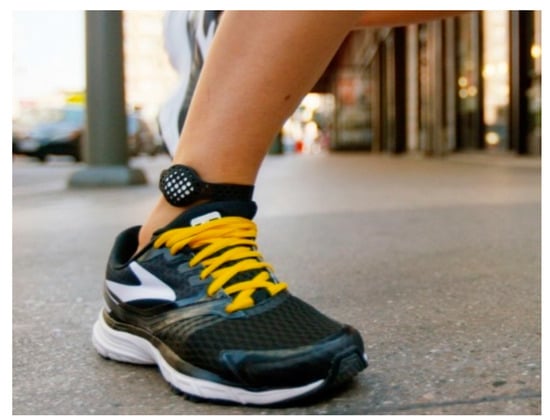 Detecting the physical activity of humans is possible with the placement of sensors, usually accelerometers and gyroscopes, on different parts of the body. There are different approaches to this, and the most common ones that are seen nowadays are pedometers, which are watches or sensors that are placed on the wrist for activity tracking. However, one limiting factor for these devices is accuracy. Therefore, sensor location needs to be updated, and a study done in 2014 proved that step counts can accurately be obtained from three-axis accelerometers placed on the thigh, waist, and ankles []. These systems performed well in low-gait-speed scenarios and outperform commercial pedometers. With this, there are several examples of activity trackers in the market and an example is shown in Figure 5.