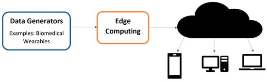 An extension of this is called Edge Computing, which performs computations at the edge of the internet []. As the shift towards IoT and IoMT continues, large quantities of data of exceptional quality will be generated by all of the devices surrounding us. It is estimated that around 50 billion things will be connected to the internet by 2020, and by 2019 people and machines will be producing 500 zettabytes of data while the global data center’s (Internet Protocol) IP traffic will only reach 10.4 zettabytes []. This means that all of these things and devices will be producing data at a much higher rate than can be processed by the cloud. As a matter of fact, growth in the bandwidth of networks has come to a standstill, and the speed of data transportation has become the main bottleneck for cloud-based computing []. This means that most of the data produced by IoT and IoMT devices will never reach the cloud. Therefore, the simple definition of edge computing is any computation that occurs between the data-generating devices and the cloud data centers []. This includes processes such as data offloading, data storage, data processing, and IoT management, as shown in Figure 6. This also improves user privacy, since the data that are sent for edge computation are normally private when compared to the cloud.