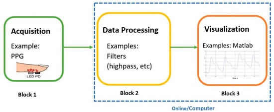 The design of any electrical device in the industry usually utilizes a team-oriented process. This means that teams are assigned a certain task that they must complete in order to create a final product. Hence, just like any other electrical device, the design and prototyping of a biomedical wearable starts by a similar team-oriented process. This creates effective teams that are focused on a common goal and use characteristics such as positive team interdependence, group accountability, and teamwork skills. In academia, analogous approaches are employed on a smaller scale where each block in the figure below represents a team and a task. Normally, a couple of students are assigned to each block (and consequently a task). The breakdown of each project varies and is very diverse; however, for biomedical and electrical engineering purposes generally, there are three important blocks or teams to be considered: Signal Acquisition, Data Processing, and Visualization of the data. The teams work together on a common goal while each individual team is focused on their own goals. This area shown in Figure 7 and the first block, Block 1, is the Acquisition phase, where raw data are captured from the human body. This is done by the sensor that is placed on the integument (skin) of the body. Block 2 is the data processing block, where digital filters and further data conditioning, such as segmentation, de-trending, and feature extraction can be applied. Block 3 is the visualization of the data using a user-friendly technique. Blocks 2 and 3 are commonly performed on a personal computer with the aid of software (MATLAB) in basic prototyping applications. In IoT applications, Blocks 2 and 3 can be done on the cloud or on a server, and this is subject to change depending on the application.