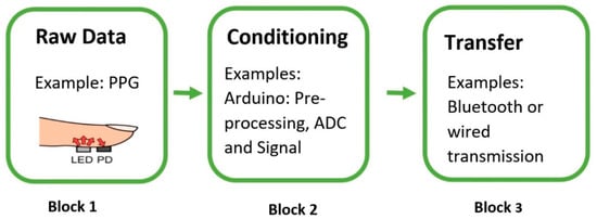 The following figure, Figure 8, focuses on the element to be covered in detail here: Acquisition. As mentioned above, acquisition refers to the front-end of the project and includes all of the hardware and software that is required for signal capture. Figure 8 below demonstrates the three main components that are necessary to acquire raw data from the human body. Block 1 of Figure 8 deals with the raw data that are captured from the sensor. Since most signals are analog, there needs to be an analog-to-digital (ADC) conversion and a way to communicate with the sensor to allow for data transfer, and that is Block 2. For this, it is vital to have open-source and low-cost tools and platforms. The most common platforms for this are Arduino and Raspberry Pi, and they have played a transformational role at the outset of biomedical wearables. The last part, Block 3, is sending the data to a server to be sent to the cloud or for analysis. Commonly, Bluetooth modules are used or Arduinos with inbuilt Bluetooth or Wi-Fi capabilities. The next section will focus entirely on the hardware used to construct the Acquisition Phase.