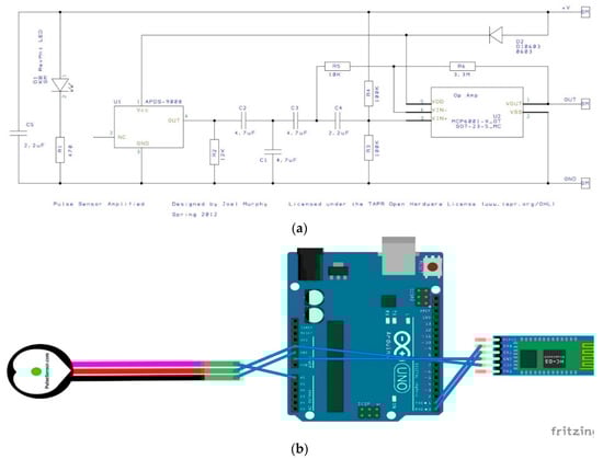 As mentioned above, the sensor is designed to be a “plug-and-play”-type sensor. What this means is that only three wires are needed to connect the sensor to the Arduino, and no external circuitry is required to operate the sensor and retrieve the PPG signals. Furthermore, the sensor itself is an open-source hardware project, and, hence, a schematic of the internals is available and is shown in Figure 9a. To connect the sensor, the three wired connections are: ground, power, and the analog signal, and these are visible in Figure 9b as well as in Table 3(a). The sensor itself was secured to the index finger using the supplied Velcro straps. Moving on, the software side of the front end required us to take advantage of the online support available on the Pulsesensor website []. First, the Arduino Library was downloaded from the Arduino IDE. Next, a provided example in this library, the GettingStarted Project, was used to blink the Arduino’s built in LED with a baud rate of 9600. Finally, to visualize the signal, the Serial Plotter on the Arduino IDE was used, and further changes can be made to this code based on the application.