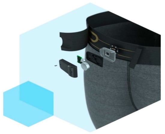 With these developments in textiles, several companies have started commercializing these e-textiles. One such example is Myant, a Canadian company that is a leader in functional fibers. They currently have a brand by the name of Skiin that has high performance smart underwear. The underwear is capable of measuring heart rate, breathing patterns, and temperature, and can track sleep, all day activity, and exercise []. It comes with a Skiin Companion App that connects to the device for bio-tracking. The current generation device costs 279 CAD, and all of the electronics are attached on the waist band in a removable compartment that is shown in Figure 14. That being said, they are releasing their next generation with functional fabrics. They have incorporated physiological sensors into their garments using advanced knitting techniques, and are now moving towards the introduction of Radio-Frequency Identification technology (RFID) []. It has been proven recently that the use of RFID technology for traditional metal-based tags allows for the capture of material deformations. The theory behind this is that, as the antenna inside the tag deforms as forces are applied, there is a change in the resonant frequency. This change is then received and correlated to a mechanical deformation on the object the tag is on []. This allows for a wearable with an incorporated strain sensor that is wireless and battery-less and, most importantly, comfortable to wear. This technology is not cheap, as it is currently in the developmental stages. The previous version that has physical sensors on the underwear costs around $280, and this new wearable could be more expensive. This technology does have vast amounts of potential; however, research and comparative studies will need to be performed to validate the signals that are retrieved from electronic textiles when compared to medical grade signals.