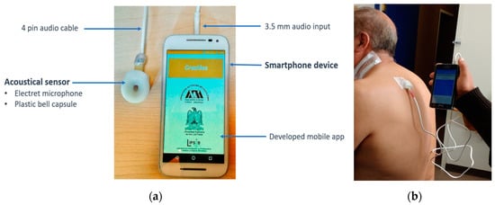 The proposed mHealth system, shown in Figure 1, consists basically of two hardware components: (1) an electret subminiature microphone (BT-2159000, Knowles Electronics, Itasca, IL, USA) encapsulated in a plastic bell designed for adequate acquisition of respiratory sounds and connected to the 3.5 mm audio input of the smartphone [], and (2) a smartphone device containing the developed mobile app governing sounds acquisition, display and processing. The developed app was mainly tested in two Android smartphone devices of low and medium performance classes, the Galaxy S4 (Samsung Group, Seoul, Korea), with 1.6 GHz quad-core processor, 2 GB RAM and running Android v5.0.1—Lollipop, and the Moto G Turbo Edition (Motorola, Chicago, IL, USA), with 1.5 GHz octa-core processor, 2 GB RAM and running Android v6.0—Marshmallow. It is worth mentioning that both smartphone devices provide reliable digitalization requirements as recommended in guidelines for respiratory sound acquisition []. Respiratory sound recording using the developed system is illustrated in Figure 1 for a DIP patient.