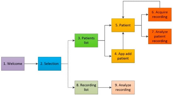 - Selection activity (SA). SA allows the user to choose between two data visualization options: (1) list of registered patients, and (2) list with all existing recordings. SA also contains menu buttons to visualize the app developing credits.
