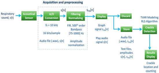 A block diagram summarizing the acquisition and processing of the respiratory sounds performed in the app is shown in Figure 3. In the next subsections, details about the acquisition and preprocessing of respiratory sounds as well as the crackle detection stage are provided.