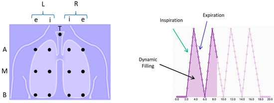 Accordingly, a sound recorded over the basal region of the right hemithorax at the exterior line would be denoted as LBe by the app. Because our research group and collaborators are interested in analyzing also tracheal sounds, an auscultation point on the trachea (T) is also available for tactile selection in the array. Similar auscultation points have been proposed by other research groups to facilitate the registration of recording locations []. In the case of the array proposed in this work, it corresponds to a simpler version of the previously introduced by our research group for multichannel acquisition and processing of respiratory sounds [].