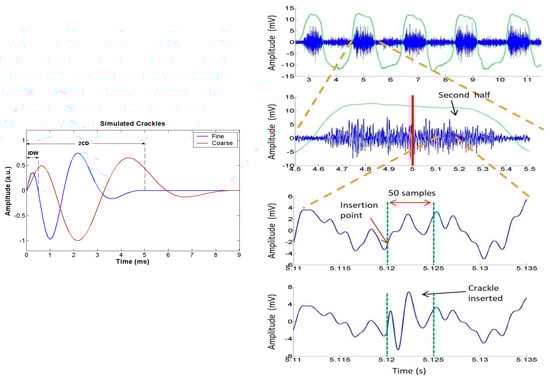 Simulated scenarios with synthetic crackle sounds. Left: Waveform of simulated fine and coarse crackles. Right: Insertion of a synthetic fine crackle at a random location using a gain factor equal to 3.5 times the variance of the basal sound in the insertion window.