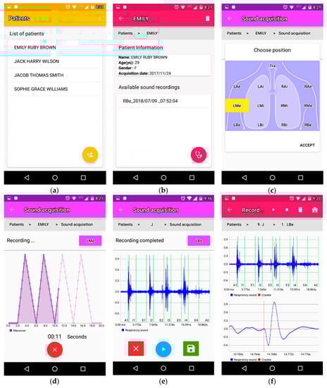 The implemented Android app requires 10 MB of space to be installed on smartphone devices. Screenshots of the implemented app are shown in Figure 7. The Patient List activity that displays the list with patients already registered is shown in Figure 7a. A FAB also allows the user to register a new patient. Figure 7b shows the Patient activity which displays the entered information of a patient. A list with the sounds already recorded for that patient is displayed in the inferior portion of the app so that the user can select one to analyze it or can use a FAB to acquire a new respiratory sound recording. Figure 7c,d shows the activities concerning the sound acquisition. The selection of the auscultation point is performed by touching a location in the graphical array (Figure 7c) and once selected, the sound acquisition activity is started so that the user can start the recording while simultaneously receiving visual feedback about the respiratory maneuver to performed by the patient (Figure 7d). The user can replay the acquired sound to analyze its quality and decide if discard it or store it for further analysis in the app (Figure 7e). Figure 7d shows the activity in charge of displaying the analysis results in terms of crackle detection. The location of the crackles is displayed as red markers on top of the respiratory sound. The user can manipulate a graph in the lower portion of the activity in terms of scrolling and zooming. In the presented example, an interval containing one crackle sound detected from a recording from a patient with respiratory disease is displayed in the zoomed version of the signal. As can be seen, the detected crackle sound resembles the morphology reported in the classical literature [,]. Regarding the performance of the developed app, the average computation time employed to process the recorded signals was around 3.5 min and was distributed as follows, 195 s for mean removal and digital filtering, 0.8 s for signal normalization, 17.9 s for signal display, and 14.1 s for automated crackle detection. In addition, it was found that the mobile app employed around 2% of the battery when 5 consecutive data acquisitions and processing, including crackle detection, were continuously performed and starting from a full charge in a 2740 mAh device, i.e., it consumed around 55 mAh in a commonly available smartphone device. Finally, it was found that, on average, only 20 MB of RAM were employed by the mobile app to run on the smartphone device.
