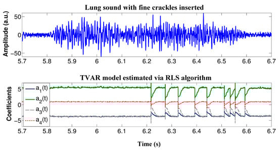 Example of RLS-TVAR coefficients estimates using the implemented mobile app. Top: Time waveform of an inspiratory sound with inserted fine crackles at the end portion. Bottom: Time course of the RLS-TVAR coefficients estimated in the app.