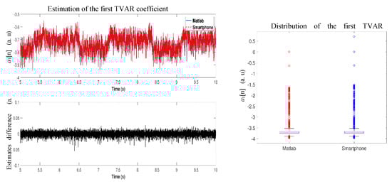 The implemented algorithm for automated detection of crackle sounds relies on the estimation of the TVAR coefficients via the RLS algorithm with fixed forgetting factor. An example of the TVAR coefficients estimated using the implemented Android app is displayed in Figure 8 for a simulated scenario with fine crackles inserted at the end the inspiratory phase. The  coefficient is not shown as its constant valued equals to 1. In Figure 8 is possible to notice the presence of simulated crackles in the respiratory sound by looking at the transients in the TVAR coefficients time series. The implementation of the RLS algorithm was tested by comparing the TVAR coefficients estimation results with those provided by a Matlab implementation using one recording. The estimated coefficients used to test the statistical significance were obtained completely in each system; i.e., after performing digital filtering; normalization and applying the RLS algorithm in a personal computer and in the app using the developed system to the same recording. No statistically significant differences were found between the two sets of estimates as analyzed by a Wilcoxon signed-rank test for any of the TVAR coefficients; p > 0.99 for  to . Figure 9 shows the distribution for a TVAR coefficient using a box plot as well as the amplitude difference versus time between its estimation using Matlab and the implemented app.