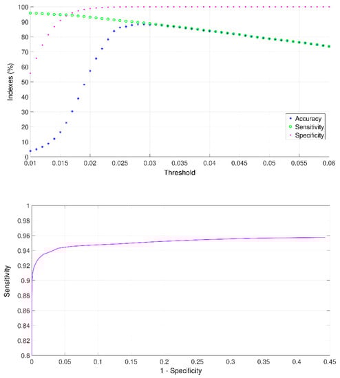 A relevant parameter for the mobile app is the selection of the threshold value. This selection was performed by varying its value from 0.010 to 0.060 and obtaining the performance indices introduced in previous section for all the simulated scenarios in Table 2 considering the respiratory information of 10 healthy subjects. Figure 10 shows the performance indices versus the threshold value employed in the developed automated crackle detector. Figure 10 top side shows the accuracy, sensitivity and specificity indices, while Figure 10 bottom side shows the receiver operating characteristic (ROC) curve. Selection of the threshold value employed in this study was based on these two results as follows. The optimum value for the pair sensibility-specificity was obtained from the ROC curve inflection and regarded as the lower limit ( = 0.019). The upper limit for the threshold value was established as the maximum point for accuracy curve ( = 0.029) where above this threshold the specificity achieves its maximum value and reaches a plateau while the sensitivity value reduced below 90%. Accordingly, the threshold value was set to the middle point between the lower and upper limits, i.e.,  = 0.024. Table 3 shows the results regarding the performance indices obtained with the selected threshold value ( = 0.024) for all analyzes recordings with synthetic crackles inserted for each scenario with different signal-to-noise-ratios.