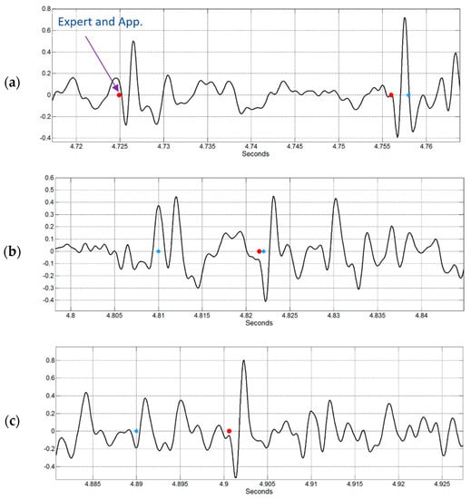 Regarding the performance indexes obtained for these real data, an average of 51% and 63% were found for the accuracy and specificity, respectively. Interestingly, a specificity of 100% was found in two cases where neither the pneumologist or the mobile app detected the presence of crackle sounds. It is worth mentioning that the detection of crackles that relies only on an auditory approach is difficult even for experts, as reported in the literature [,]. The task appears to be also challenging when using the TEWA criteria as illustrated by the examples shown in Figure 11, where the detected location marked by pneumologists and the app are represented by blue and red dots, respectively. Two examples of real crackles correctly detected by both pneumologists and the app are shown in Figure 11a where TEWA criteria correctly holds. Figure 11b shows an example where both the pneumologists and the app match the detection of a crackle sound (around 4.82 s) but the physician also indicates the presence of another crackle (around 4.81 s) which does not appear to resemble the classical morphology expected, while the smartphone does not detect it. Figure 11c shows an example when the app detects a crackle sound while the physician does not (around 4.91 s) although it follows the expected morphology. The additional crackle indicated by the physician (around 4.89 s) is another example of a case where doubts arise regarding the presence of a real crackle.
