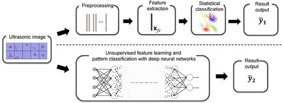 In order to establish an algorithmic benchmark for automatic ultrasonic inspection image analysis, we present a review of computer vision systems and introduce the fundamental techniques in this section. As shown in the upper and lower regions of Figure 2, nowadays, computer vision systems can be generally categorized into two types: the conventional ones which adopt a two-stage pipeline, including hand-crafted feature extraction and statistical machine learning; and another family which relies on deep neural network (DNN) learning architecture to acquire critical feature representation with respect to a given task without human intervention. Driven by the availability of both large-scale annotated datasets and sufficient computation power, the latter DNN-based schemes are taking the place of manual feature engineering in most of the current AI-enabled applications [7]. In our evaluation, we compare both schemes for the focused task of ultrasonic image pattern analysis. We introduce the details of representative techniques as follows.