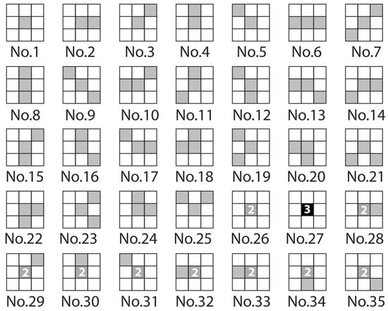 Higher-order local auto-correlation (HLAC) features are conventional local descriptors for 2D patches [31], and it has been successfully applied to a wide variety of real applications, including texture classification and medical imaging. The mask patterns of HLAC are shown in Figure 3. The HLAC features are well developed based on the higher-order autocorrelation function: