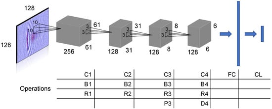 We first propose a DNN system with a simple sequential structure, and we introduce the design in Figure 4. Because the layout is not carefully tailored, we treat its performance as the baseline of the deep learning-based approach. In our notations, the input is a 128 × 128-pixel RGB image, and the output is a vector with two entries connected with the softmax classification layer (noted as CL). The proposed scheme consists of four convolution layers, which are C1 ⋯ C4. Batch normalization and ReLU activation gating, noted as B1 ⋯ B4 and R1 ⋯ R4, respectively, are applied after the convolution operation. P3 is a pooling layer to reduce the size of the feature map. D4 indicates the dropout layer which can effectively prevent overfitting by discarding a ratio of neural connections [34]. At the fully connected (FC) layer, we flatten all weights and obtain a high-dimensional vector representation. Finally, the classification layer (CL) converts the data value to defect/no-defect categorical membership score.