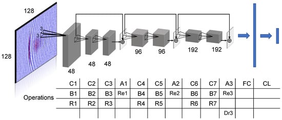 We explain the detailed process at each layer as follows. The input and output are a 128 × 128-pixel RGB image and a two-element vector of defect/no-defect membership scores, respectively. There are seven convolution layers employed, noted as C1 ⋯ C7. At each layer, the convolution operations are performed to seek for specific defect-induced ultrasonic wave patterns. The convolution kernel size is set to 3 × 3 pixels. Batch normalization and ReLU activation gating, noted as B1 ⋯ B7 and R1 ⋯ R7, are applied after convolutions. Notably, three "short cut" modules are adopted, that is, by assigning adding layers noted as A1 ⋯ A3, back-propagating weights can jump ahead to earlier layers without decay. Re1 ⋯ Re3 denotes the ReLU gating performed at the combination layer of each residual module. Right before the fully connected layer (FC), a drop layer Dr3 is employed to prevent overfitting. Finally, the classification layer (CL) computes the probability of defect presence by using the softmax function.