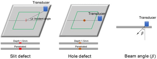 The shape, size, and depth of flaws are critical parameters affecting visual inspection. To evaluate the automatic ultrasonic image investigation approaches, we prepared a batch of stainless steel plates with various types of flaws. Table 2 shows the specimen details and Figure 6 presents our ultrasonic inspection schemes. In the evaluation, two types of defects were investigated: drill holes with a diameter from 1 to 5 mm and slits with lengths ranging from 3 to 10 mm. A laser scan is performed on the central region of 3 mm thick specimens with a 100 × 100 mm size (green zone) on both the front and back sides of the steel plates. It is noteworthy that the incident angle of the transducer installation can be a critical parameter that significantly affects the ultrasonic imaging patterns, especially when examining slit flaws. To exploit the robustness of computer vision algorithms to those variations, we collected ultrasonic inspection images with different incident angles varying from 0 to 90 with a 22.5 interval.