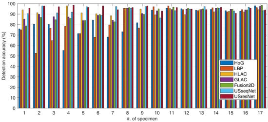 Figure 9 reveals more details regarding the evaluation, as the detection accuracies for each specimen are shown. It is evident that the defect-induced patterns from several specimens are more difficult to distinguish, such as those from No. 1–6. In general, slit defects are easier to detect from computerized visual inspection compared to the hole flaws. Notably, conventional visual features are incapable of characterizing critical discriminant information for flaw detection, and severe accuracy drops can be seen when dealing with hole damage. On the contrary, deep learning-based solutions are quite robust. Especially for the USresNet design, there is quite a small performance variance for all the specimens. As a result, the proposed USresNet outperformed all other methods in both accuracy and stability.