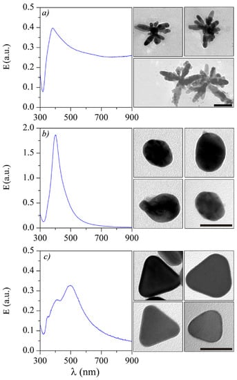 Extinction spectra, E, of colloidal suspensions of Ag nanoparticles with different shapes: (a) Ag-NSs; (b) Ag-NSPs and (c) Ag-NPLs, with their corresponding TEM images on the right-hand side. The scale bar is 100 nm for (a) and 50 nm for (b,c).