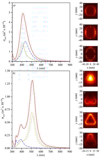 Resonances in the experimental measurements of extinction spectra, E, in Figure 1 can be fitted with numerical results for the extinction cross-sections () in Figure 2 and Figure 3, calculated with the FDTD technique by using the geometrical dimensions from the TEM images. The extinction cross-section is calculated as , where  and  (in units of W) are the total power scattered and absorbed by the particle. Figure 2a shows the calculated extinction spectra for a sphere (with  nm), and for an ellipsoid with semi-minor and semi-major axes  nm and  nm, with circular cross-section under the two main polarizations. Figure 2c–e show the corresponding field profiles, as pointed in the insets in Figure 2a. Figure 2b,f–i show the calculated extinction spectra for a triangular Ag-NPL, with  nm, for field–particle interactions along all the main axes and their corresponding field profiles. The extinction spectra for colloidal suspensions must be a weighted average of the extinction spectra for all the geometries and field–particle interactions in the sample. One should note that the sums of the corresponding extinction spectra are in qualitative agreement with the experimental spectra, since Figure 2a shows the broad peak for Ag-NSPs (resembling Figure 1b) and Figure 2b resembles the LSPR peaks in Figure 1c.