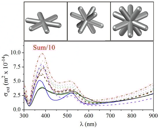 While the spectra for spherical/ellipsoidal and triangular silver nanoparticles have been consistently obtained in the literature with theoretical simulations such as those shown in Figure 2, the same does not apply to the spectrum of the nanostars (Ag-NSs). Indeed, due to the absence of such a theoretical study for Ag-NSs, the tail in extinction at wavelengths  nm in Figure 1a has been attributed to a combined effect of agglomeration and different morphologies in the sample [,,]. However, from our simulations in Figure 3, it is clear that both plasmonic bands at around  nm and  nm, and the long wavelength tail can be obtained from individual response from stars with six, eight, and twelve-arms, and their combinations, with no need to assume that there is aggregation. In the calculations, we used the arms length as  nm, i.e., the tip to tip length is 220 nm, and a circular cross-section with diameter 38 nm, taken from the TEM images. A tail was present in  for all the Ag-NSs, which clearly indicates that it is not a consequence of a mixture of Ag-NSs with different numbers of arms as supposed in previous works [,,,]. The more intense band near  nm in Figure 1a is well captured for all the stars considered and polarizations, but the smaller band in the numerical results is not observable in the experimental results. This latter band does not appear because of the high heterogeneity of morphology of nanoparticles in the sample, which contributes to widening the more intense resonance band. As a consequence, the smaller band is masked. This behavior can be inferred from results in Figure 2 and Figure 3.