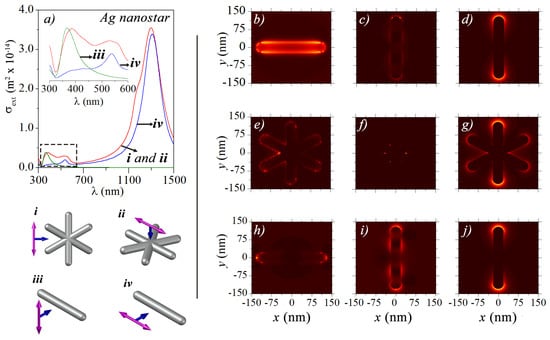 We show that the apparent tail in the extinction spectra of Ag-NSs at large wavelengths ( nm) is due to a residual component of a dipolar plasmon-resonance excitation, which for large tip-to-tip sizes is located outside the UV-Vis region. The red line in Figure 4a corresponds to the numerical  for an Ag-NS with six-arms, with a tip-to-tip length of 220 nm for incident wavelengths up to  nm. Excitation of a strong LSPR around  nm is observed, owing to the large size of Ag-NSs, which may be relevant for luminescence enhancement of rare earths [,] (emitting in the near-infrared), and for theranostic and phototherapy applications [,]. For understanding the shape of these resonances, we calculate  for Ag-NRs under transversal and longitudinal electric field polarizations, as shown in the insets in Figure 4, denoted by iii and iv. The nanorod size was taken as 220 nm according to the tip-to-tip sizes of Ag-NSs. Numerical results for the extinction cross-section spectra of Ag-NRs under transversal and longitudinal polarizations are given in green and blue lines in Figure 4a. Significantly, the spectrum of Ag-NSs can result from the superposition of spectra of Ag-NRs—mimicking the arms—positioned at different directions, as in the inset in Figure 4a that shows a zoom of  for . The smaller band for  of Ag-NSs, around 350–380 nm, can be assigned to the quadrupolar plasmon due to the transversal resonance of arms [], as this mode could not be excited with longitudinal polarization due to symmetry considerations. On the other hand, the octupole-mode around 530 nm can only be excited for sufficiently large Ag-NRs [], as in the present case. The strongest dipolar plasmon resonance for Ag-NSs, around 1300 nm, resembles the dipolar plasmon resonances for Ag-NRs. Figure 4b–g show the calculated near-field for Ag-NRs and Ag-NSs at their respective LSPRs, while Figure 4h–j show a lateral-side view of the near-field for results in Figure 4e–g. By comparing the near field distributions in Figure 4b–d with the ones in Figure 4h–j, we readily note the similarity in their symmetry properties, as predicted from the results for the extinction spectra.