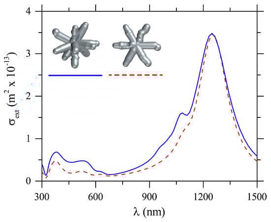 Averaged numerical extinction cross-section spectra, , for rough nanostars with geometries closer to the ones from TEM images in Figure 1a. Arm lengths for both structures range from 110 nm to 140 nm.