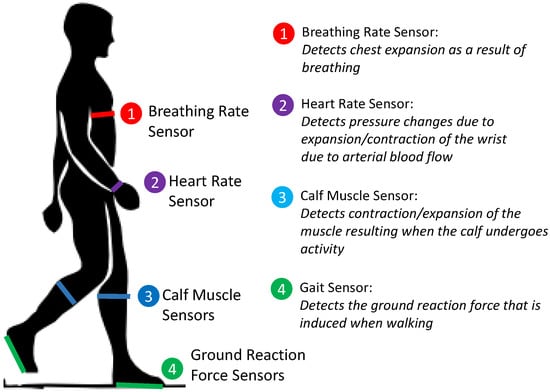 Gait analysis is of interest to researchers and clinicians as it allows the identification of the kinematic parameters of gait which can provide quantitative analysis of muscular-skeletal functions []. Such sensors are used in sports to analyze and optimize performance [], for rehabilitation, to monitor the healing of patients and for health diagnosis to determine muscular-skeletal problems and diseases []. Being able to precisely understand the force applied to specific foot locations has many applications. There are existing force sensors used to measure ground reaction forces (GRF) when walking by including sensors in an instrumented shoe. Determining muscle activity and deformation can also be used to determine gait characteristics particularly by considering the deformation of the calf muscle. Strain-detecting sensors can also be used to detect muscle activity such as grasping, or lifting [], enabling the identification of activity.