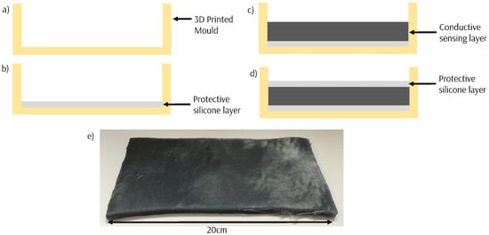 The silicone sensor material is formed into sheets by sandwiching between two thin insulating outer layers silicone (Figure 2) which are formed in 3D-printed molds. This protects the sensor and allows the sheets to be easily cut into the shape required. The sensors can be made fully waterproof by surrounding them in a full layer of silicone.