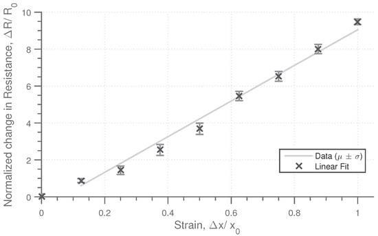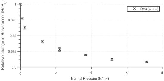 The sensing material is also sensitive to normal pressure. The pressure dependency was determined by applying a normal pressure and measuring the end-to-end resistance of the sensing material. The results (Figure 4) show that for up to 4 Nm−2 there is a significant initial reduction in resistance; however, after this point, there is minimal reduction in the resistance measured. A similar response to normal pressure has been obtained as to other similar silicone-based pressure sensors []. The material compression properties contribute to the resistive properties of the material, with the rate of resistance decreasing with normal pressure. The range of sensitivity can be altered by changing the physical height of the sensing material and the percentage inclusion of the conductive particles.