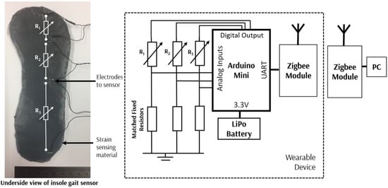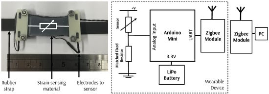 Strain-sensing sensor (left) and the overview of the wearable sensing system developed showing the interface between the sensor and the microcontroller (right).