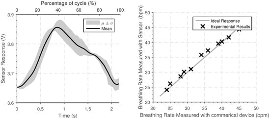 (Left) Average sensor response for the sensor when worn around the chest to measure breathing rate for a two-minute period. (Right) Experimentally measured breathing rate measured over a thirty-second period and the breathing rate determined by a commercial measurement system (iCare).
