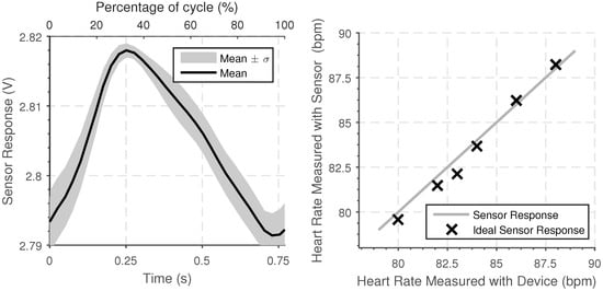 (Left) Average time series of the sensor response when the sensor is worn around the wrist for one period of heart beat when measured over a two-minute period. (Right) Experimentally measured heart rate measured over a thirty-second period and the heartrate determined by a commercial device (Polar M400, Polar Electro 2018, Finland).
