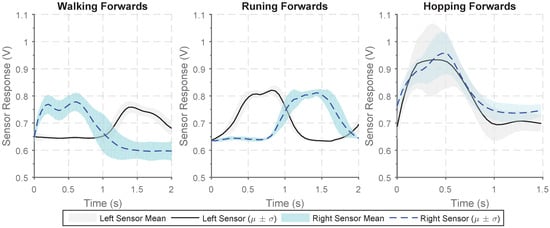 Average sensor output for a single period from two calf strain sensors worn when undertaking various gait types: walking forwards in a straight line, running forwards, hopping forwards.