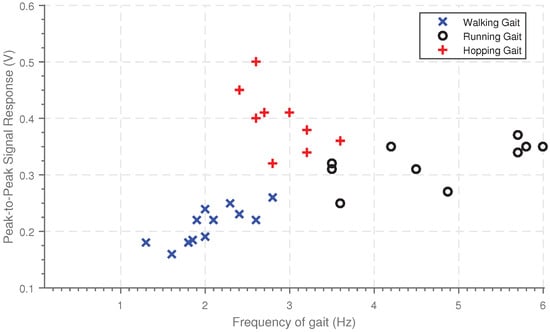 Using these sensors to determine the peak-to-peak signal response and the frequency of the gait allows different gait types to be determined. Figure 11 shows the magnitude of the response plotted against frequency of the gait for three different gait patterns. There is clear clustering between the three gait types. Walking has the lowest frequency and magnitude, running has a higher magnitude of sensor response and frequency and finally, hopping has the largest magnitude of response. The phase difference between the two responses could also be used to aid identification of the gain type.