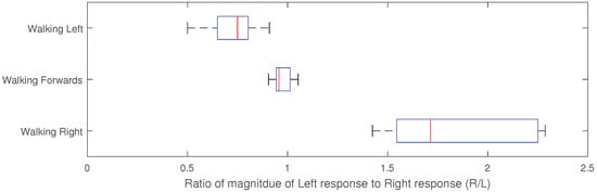 By having two calf muscle sensors, it is possible to get an indication of the direction of movement as the expansion and contraction behavior of the two calf muscles varies not walking directly forwards. The magnitude of the average of the peak-to-peak sensor response for the two sensors has been determined for ten-second periods, for 30 different cases of walking left, right and forwards. The ratio of the average magnitude between the right and the left sensor is then found. When walking forwards the sensor response is equal, such that the ratio is approximately 1. When walking right, the left calf muscle activation is greater such that the ratio is greater than one, and conversely when walking left, the right calf muscle is lower such that the ratio is less than one. These results are shown in Figure 12; the different gain types have distinct different ratios allowing unique identification.