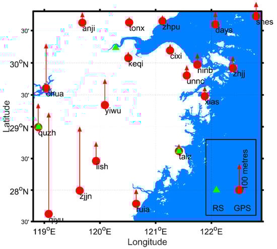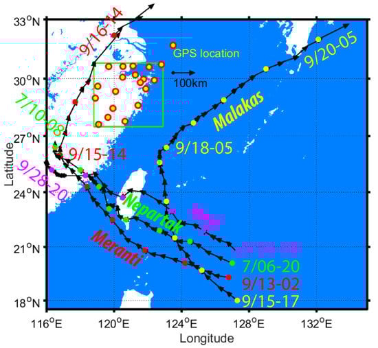 Typhoons frequently occur around Zhejiang province every year and cause heavy rainfall and flooding. There were four typhoon events that affected the Zhejiang province in 2016. The first one is named “NEPARTAK” and occurred in July 2016. The other three were named “MERANTI”, “MALAKAS”, and “MEGI”, and occurred in September 2016. MERANTI landfall location occurred at Xiamen, Fujian province at 03:05 in September 2016. The wind speed of the typhoon’s centre was up to 48 m/s, with its pressure at 945 hPa. The average rainfall in Ningbo, where University of Nottingham Ningbo China (UNNC) GPS station is located in Figure 9, is 229 mm. The rainfall in some districts in Ningbo was as high as 444 mm during the typhoon event. The NEPARTAK and MEGI typhoons were a little weaker than MERANTI and also caused heavy rainfall in Ningbo. Table 1 gives the wind speed and pressure of the typhoons’ centre, as well as the average and maximum rainfall during the typhoon period. MALAKAS did not arrive in China mainland. The nearest distance between the Ningbo and MALAKAS route is approximate 360 km.