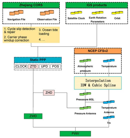 Flowchart for PWV retrieval from GPS PPP and NCEP sCFSv2 dataset. IGS—International GNSS Services; ZTD—zenith total delay; ZHD—zenith hydrostatic delay; ZWD—zenith wet delay; IDW—inverse distance weighted; UPD—uncalibrated phase delay; POS—position; MSL-mean sea level.