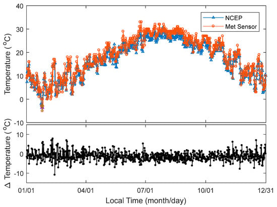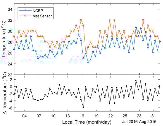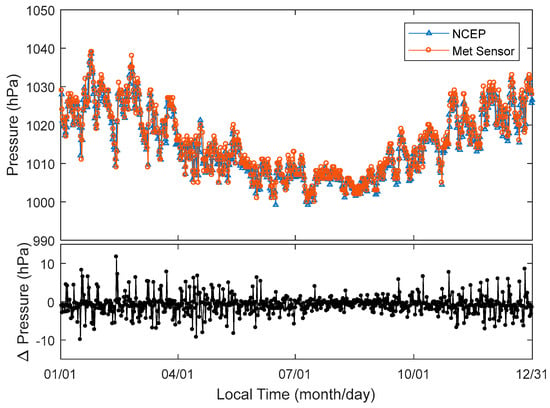 Radiosonde meteorological readings were used as a benchmark in comparing the temperature and atmospheric pressure, which is interpolated by the NCEP CFSv2 re-analysed data. The horizontal and vertical distances between GPS antenna and meteorological sensor at the Taiz station are 176.5 m and 16.1 m, respectively. Hence, the meteorological conditions at both places can be treated as the same. Figure 3 top panel shows the temperatures interpolated by the NCEP re-analysed data at the Zhejiang CORS Taiz station. It also shows the temperatures from the radiosonde readings at HOJA, measured twice a day routinely over the whole year of 2016. The trend of temperature changing from NCEP and radiosonde readings are consistent. The bottom panel of Figure 3 shows the time series of temperature difference. Most of the temperature differences are between ±8 °C, only one record exceeds −10 °C. Figure 4 shows the temperatures from the NCEP and radiosonde in July 2016. Most of the interpolated temperatures from NCEP datasets are lower than that from the meteorological sensor readings. The differences in temperature from the interpolated NCEP dataset and meteorological sensor readings are between −6 °C and 2 °C. Relative changes from NCEP CFSv2 interpolated temperature are higher than those from meteorological sensor readings. The temperature does not change as much as shown by the blue line in Figure 4. This implies that the interpolated temperature from NCEP CFSv2 has worse precision than that measured by the temperature sensor.