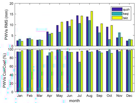 Figure 6 shows the PWV waveforms computed using the radiosonde and data calculated from the GPS PPP and NCEP CFSv2 re-analysed dataset at the station of HOJA and Taiz, respectively. The gradual changes of PWVs from the radiosonde and GPS + NCEP CFSv2 are consistent. This shows the feasibility of using the GPS PPP and NCEP CFSv2 re-analysed dataset for retrieving PWV. The differences of PWVs from radiosonde and GPS are obvious (Figure 6). The PWV from June to October can exceed 20 mm (Figure 6 bottom panel). The RMS of PWV differences between GPS and radiosonde was calculated, which shows that the RMS of PWV differences in January, February, March, November, and December is not more than 5 mm (Figure 7, top panel). It is approximately 5 mm in April. The RMS of PWV differences is bigger and higher, and approaches 10 mm from May to October at Quzh, Keqi, and Taiz. Figure 7 bottom panel shows the correlation coefficient of the radiosonde and GPS PWV time series. Most of the correlation coefficients are more than 90% at the station pairs of Quzh, Taiz, and Keqi. The correlation coefficient of the PWV time series implies that the PWVs estimated from GPS and radiosonde are consistent. By comparing Figure 6 with Figure 3 and Figure 5, the PWV differences of radiosonde and GPS are high between May and October. However, the atmospheric pressure differences occurred between January and the beginning of June, November, and December. This implies that the atmospheric pressure precision does not have a significant effect on the accuracy of PWV retrieved by GPS.
